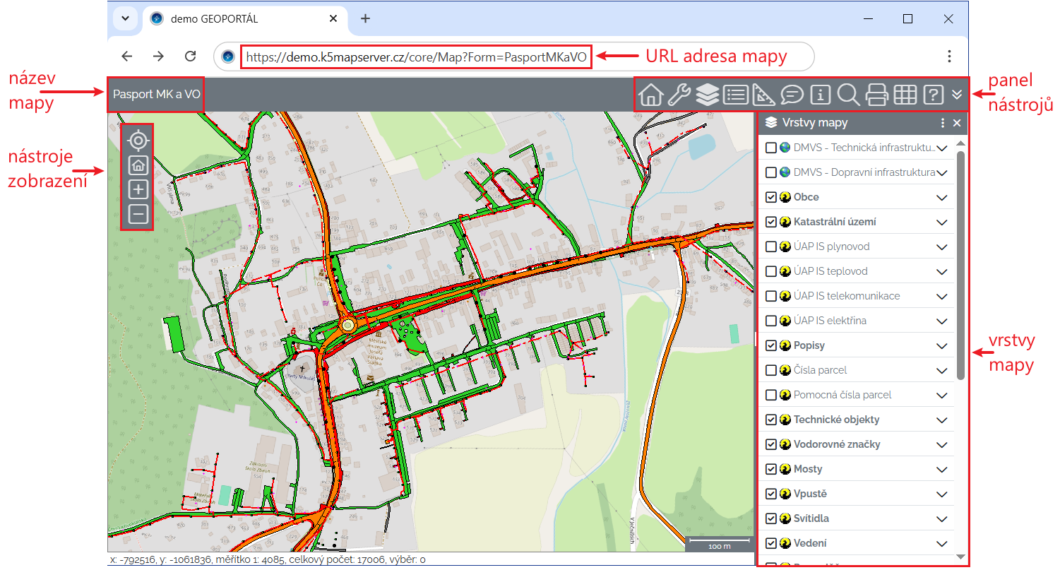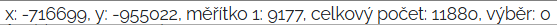 Jsou zde zobrazeny aktuální x,y souřadnice kurzoru, měřítko mapy, celkový počet zobrazených objektů a počet právě vybraných objektů.
