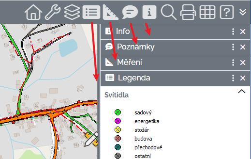 Poznámky - zobrazí / skryje panel s nástroji pro tvorbu grafických poznámek v mapě