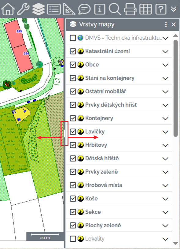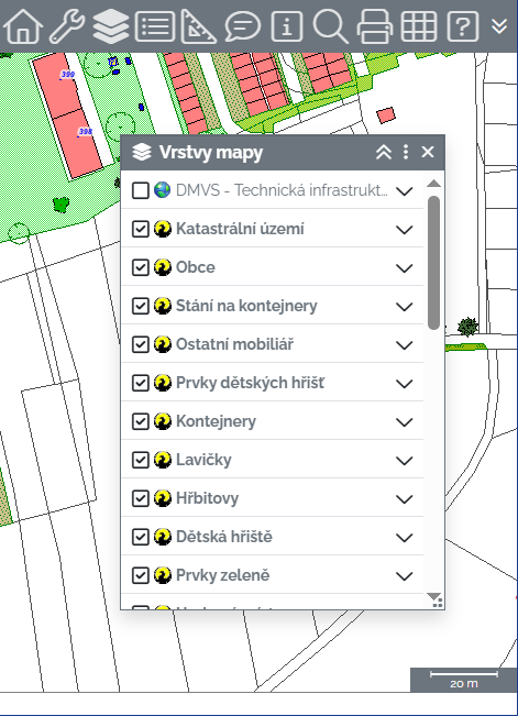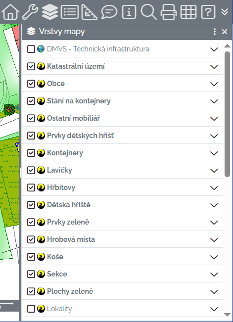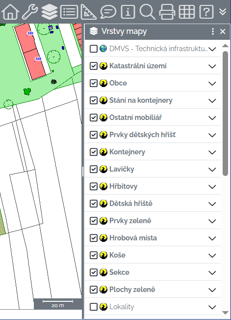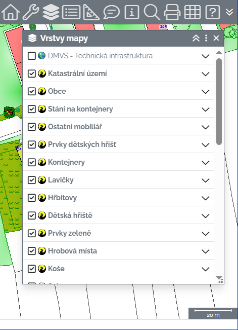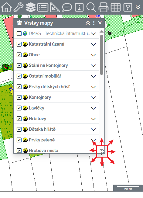 Vrstvy mapy - zobrazí / skryje panel pro ovládání vrstev mapy