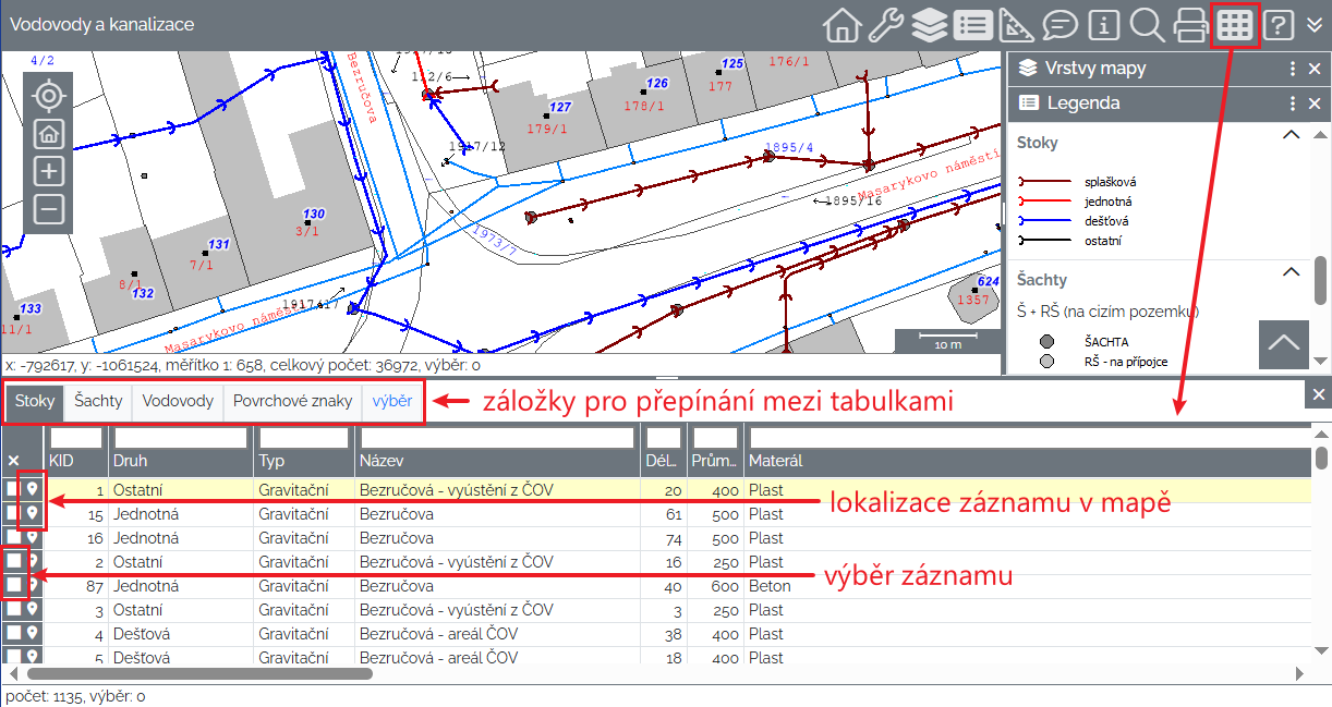 Negrafická data v tabulkách je možné filtrovat podle různých podmínek a vyfiltrované záznamy následně vyhledat v mapě.