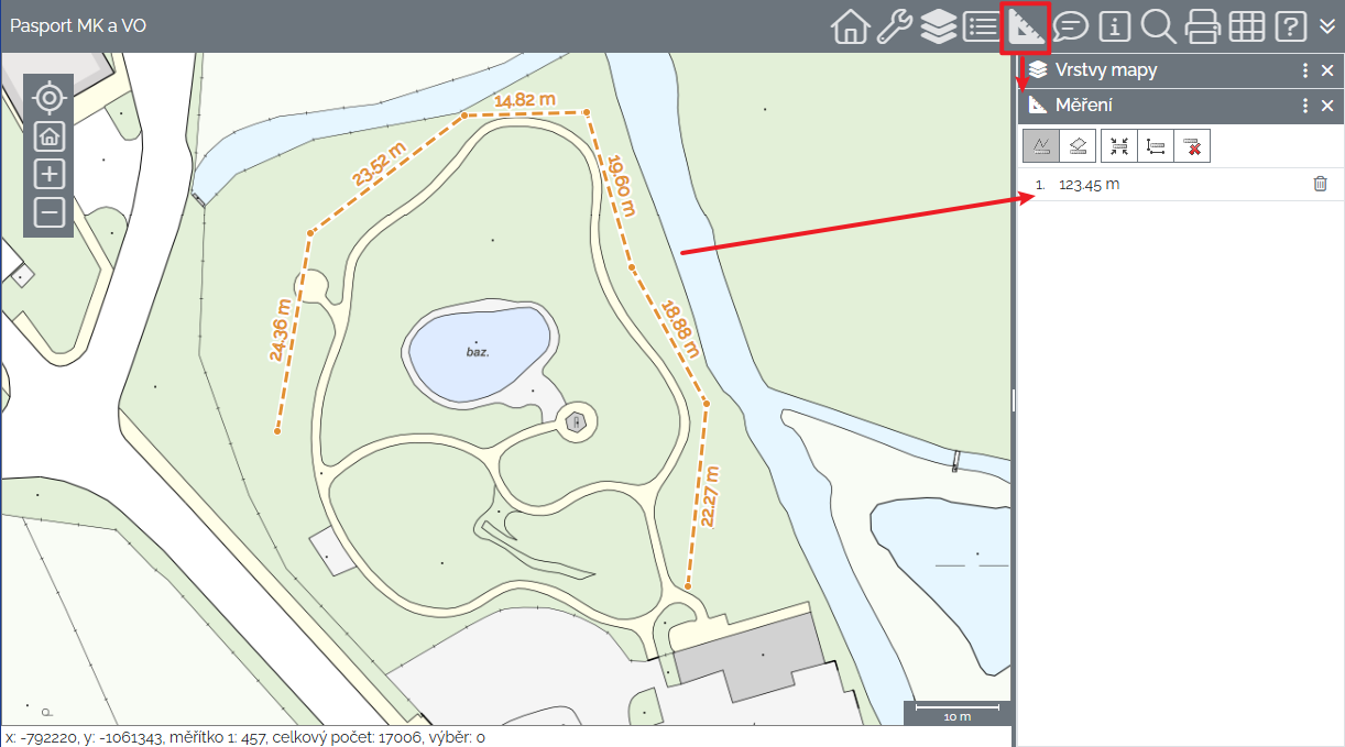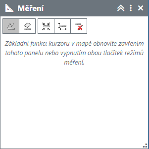 kliknutí na ikonu Měření vzdálenosti na panelu Měření zahájí režim měření vzdálenosti v mapě
