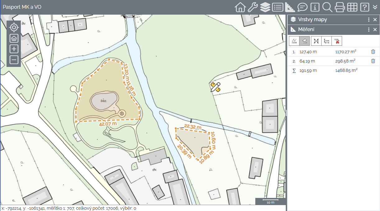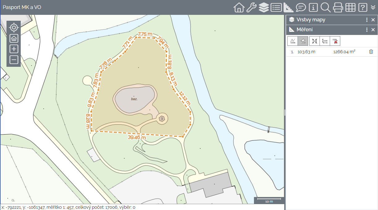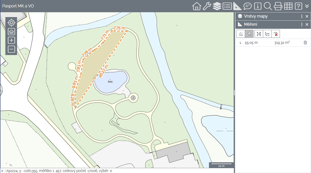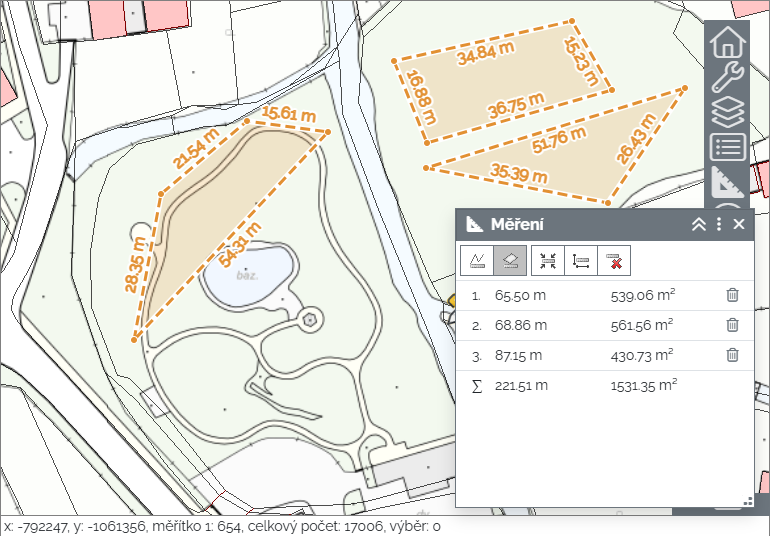 kliknutím na ikonu Měření plochy na panelu Měření je zahájeno měření plochy v mapě