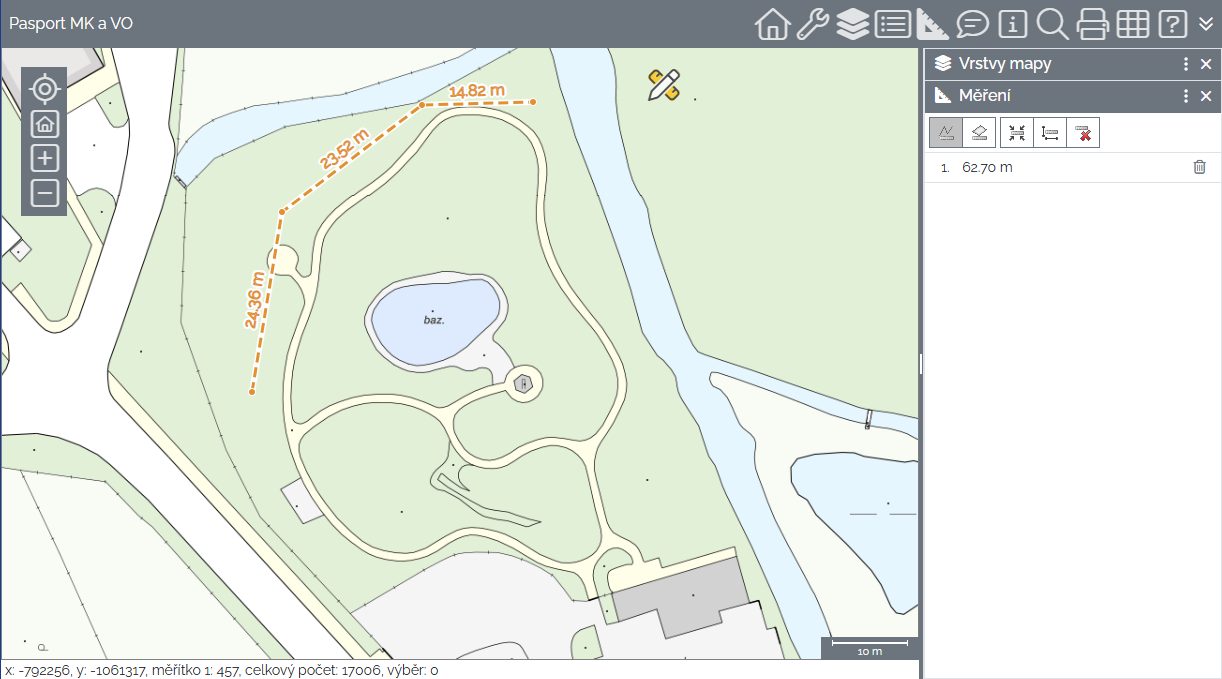 slouží pro měření vzdáleností a ploch v mapě.