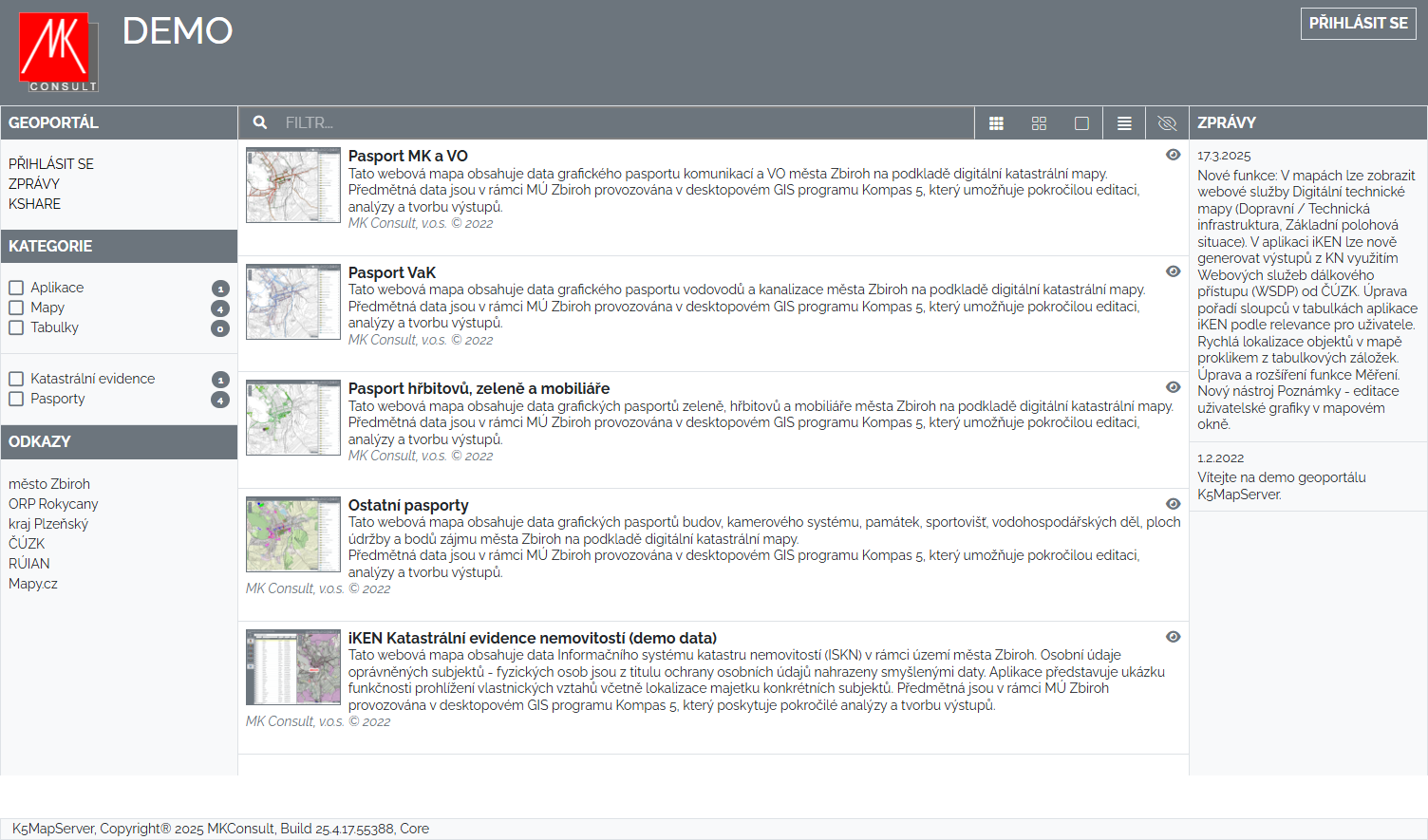 Webový GIS K5 MapServer se skládá z domovské stránky, tzv. Geoportál a jednotlivých mapových aplikací (uživatelského obsahu).