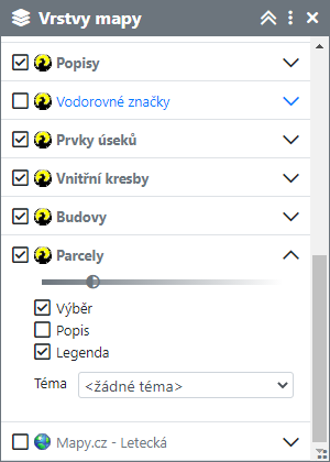 Panel umožňuje nastavit vlastnosti vrstev (Výběr, Popis, Legenda, Téma a průhlednost).
