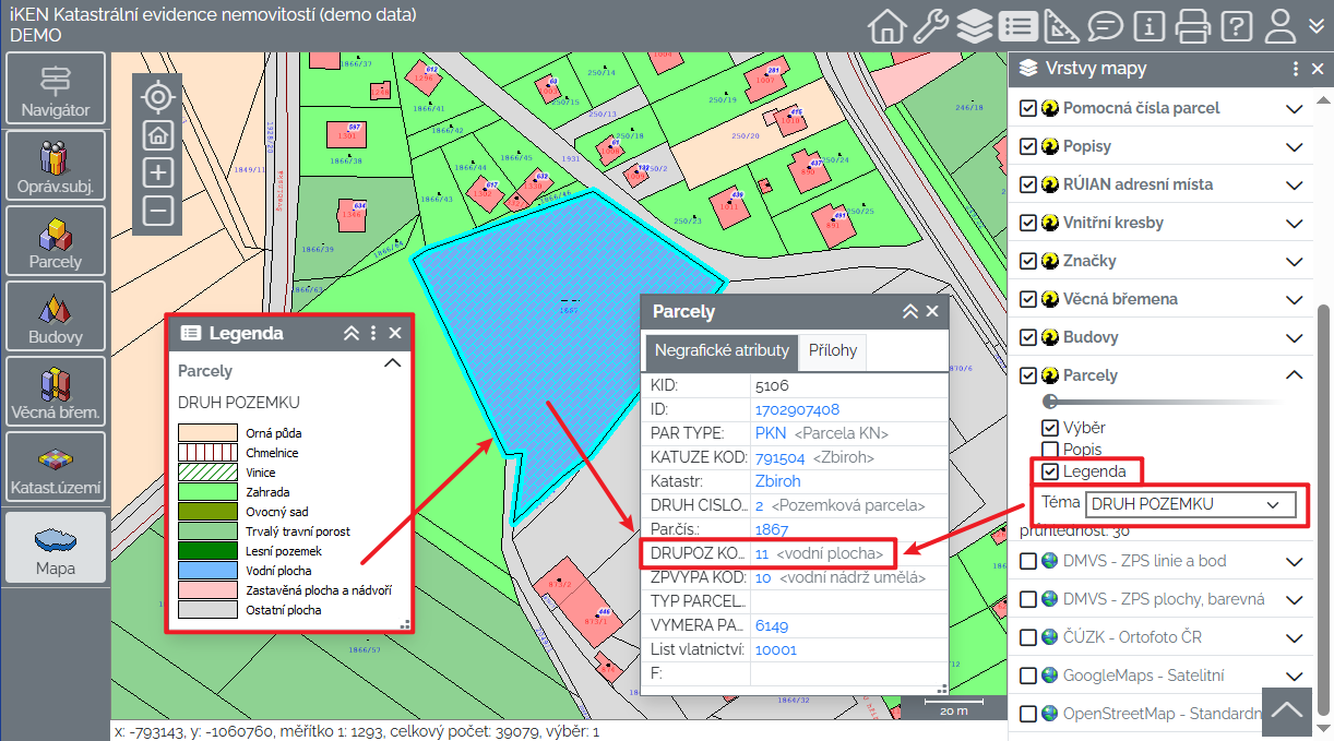 Téma DRUH POZEMKU na vrstvě Parcely obarví jednotlivé objekty parcel podle hodnoty atributu "DRUPOZ_KOD" (kód druhu pozemku)