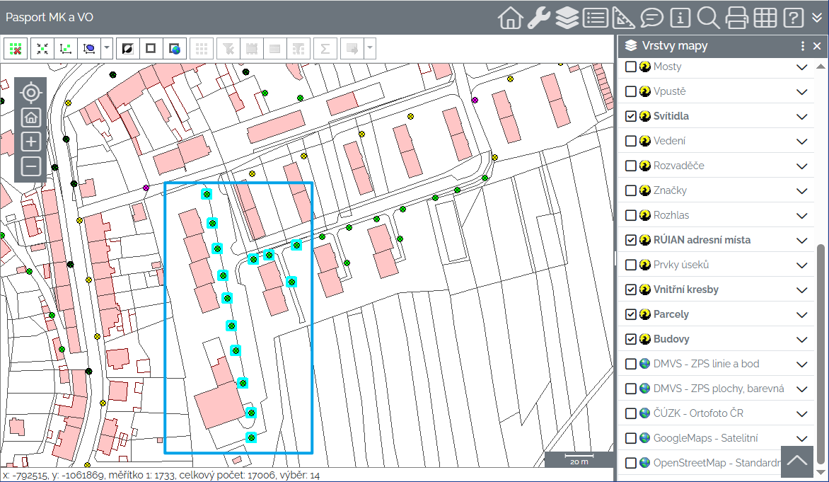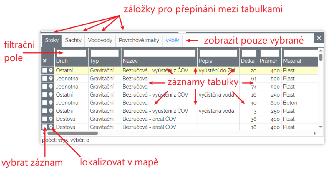 Negrafické údaje objektů lze prohlížet prostřednictvím panelu Info nebo v panelu Tabulky, kde je možné zobrazit pouze vybrané objekty v mapě pomocí nástroje (režimu) Tabulka - zobrazení výběru ![]()
