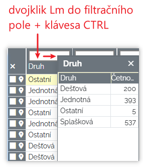 a současně stisknutá klávesa CTRL vyvolá Výčet hodnot včetně četnosti, tj. tabulku se zobrazením unikátních hodnot v daném sloupci včetně uvedení četnosti jednotlivých záznamů.